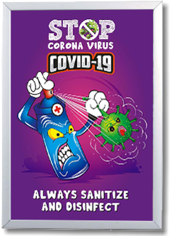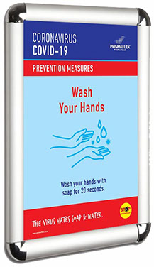 Add a set of upmarket aluminium snapper clip frames that are easy to mount. The result being a great looking elegant frame that suits any environment and enables the quick and easy flighting of your COVID-19 Coronavirus posters as well as any other posters you want to display in the future in an upmarket and corporate way. Frames come in 25mm wide and 32mm wide.