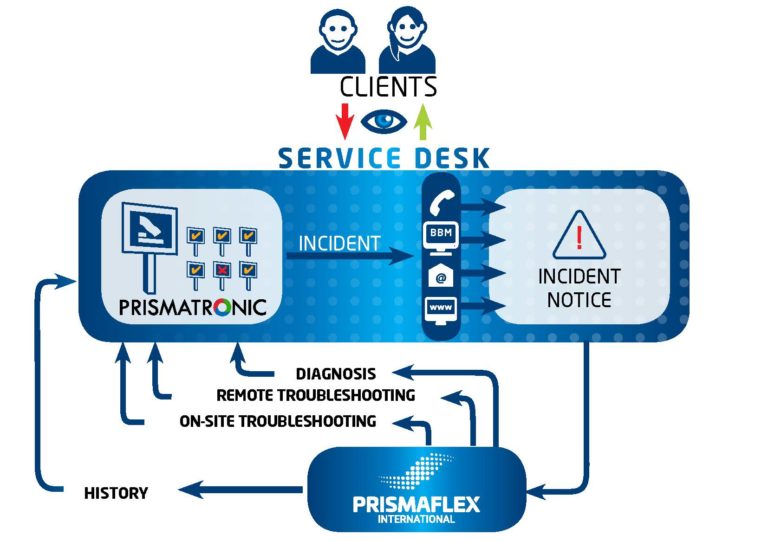 To monitor our LED screens, Prismaflex International provides clients with access to a global platform called “Service Desk”. Each call generates a ticket that remains open until a response has been provided.